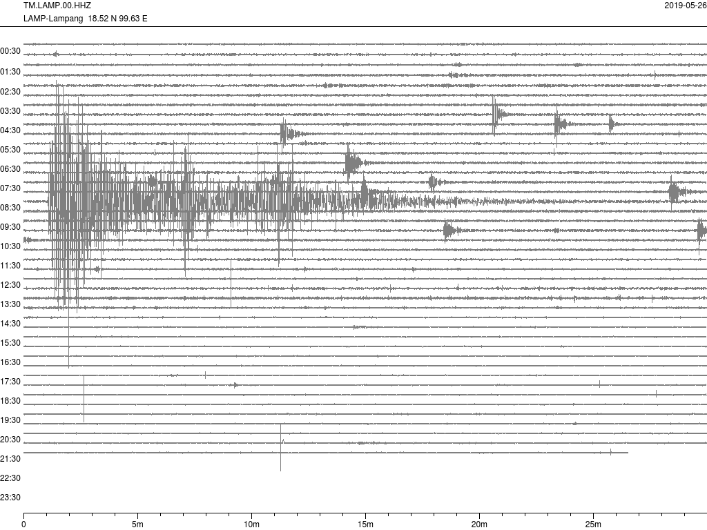 - กราฟแผ่นดินไหวจากสถานีเขื่อนกิ่วลม จ.ลำปาง (LAMP) ของสำนักเฝ้าระวังฯ กรมอุตุฯ จากเวลา 07:00 เมื่อวานนี้ถึง 07:00 เช้านี้