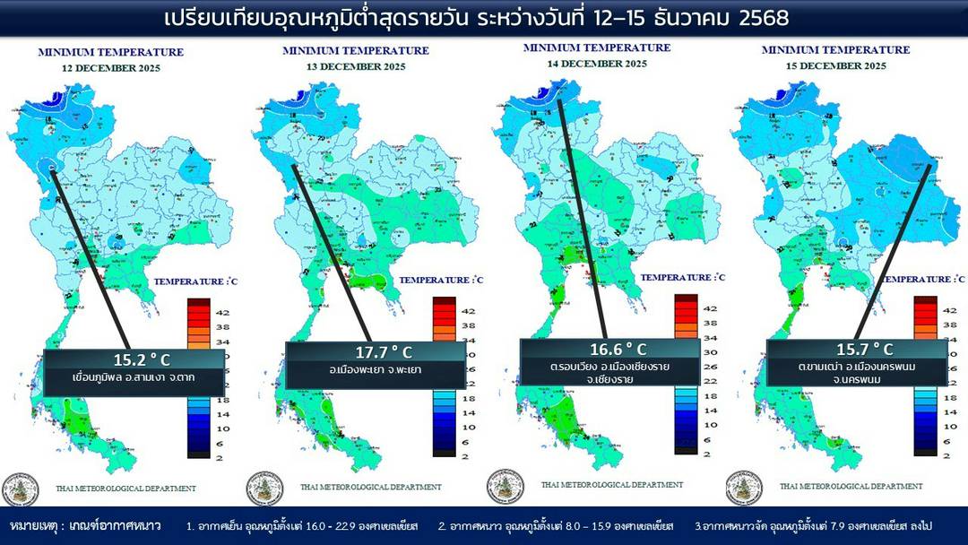 - 07:00 แผนที่เปรียบเทียบอุณหภูมิต่ำสุดในประเทศไทยรอบ 24 ชั่วโมงย้อนหลัง 4 วัน