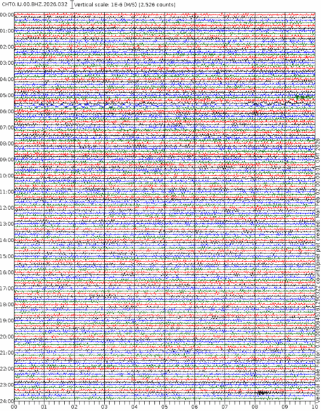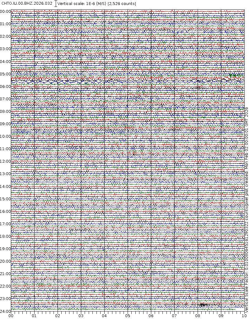 - 06:59 กราฟแผ่นดินไหวชนิดที่ใช้ดูเวลาเกิดเหตุเป็นหลัก แสดงภาพตามแนวตั้ง (BHZ) จากสถานีเครือข่าย IRIS สาขาเชียงใหม่ (CHTO) จาก 07:00 เช้าเมื่อวานนี้จนถึงเวลานี้ เส้นกราฟตามแนวนอนเส้นละ 10 นาที แยกสีเส้นกราฟเพื่อให้ดูได้ง่าย ช่องแบ่งตามแนวตั้งช่องละ 1 นาที