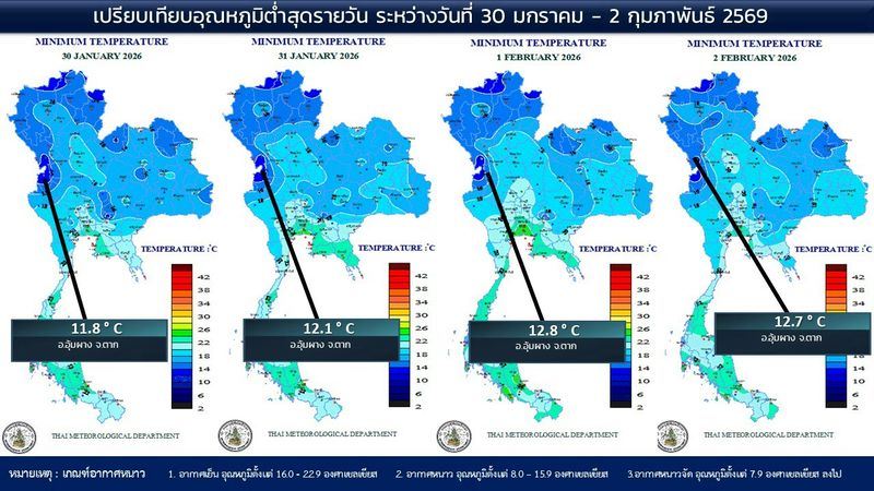 - 07:00 แผนที่เปรียบเทียบอุณหภูมิต่ำสุดในประเทศไทยรอบ 24 ชั่วโมงย้อนหลัง 4 วัน