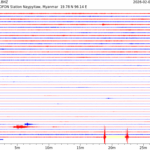 - 09:32 กราฟแผ่นดินไหว ช่วง 24 ชั่วโมงที่ผ่านมา บันทึกจากสถานีกรุงเนปิดอว์ ประเทศพม่า (กราฟนี้เน้นใช้ประโยชน์เรื่องของเวลาที่เกิดแผ่นดินไหว โดยแยกสีเป็นแดงน้ำเงินสีละครึ่งชั่วโมงเพื่อให้ดูง่าย ส่วนเรื่องขนาดแผ่นดินไหว กราฟนี้ไม่อาจใช้ระบุตัวเลขที่ชัดเจน)