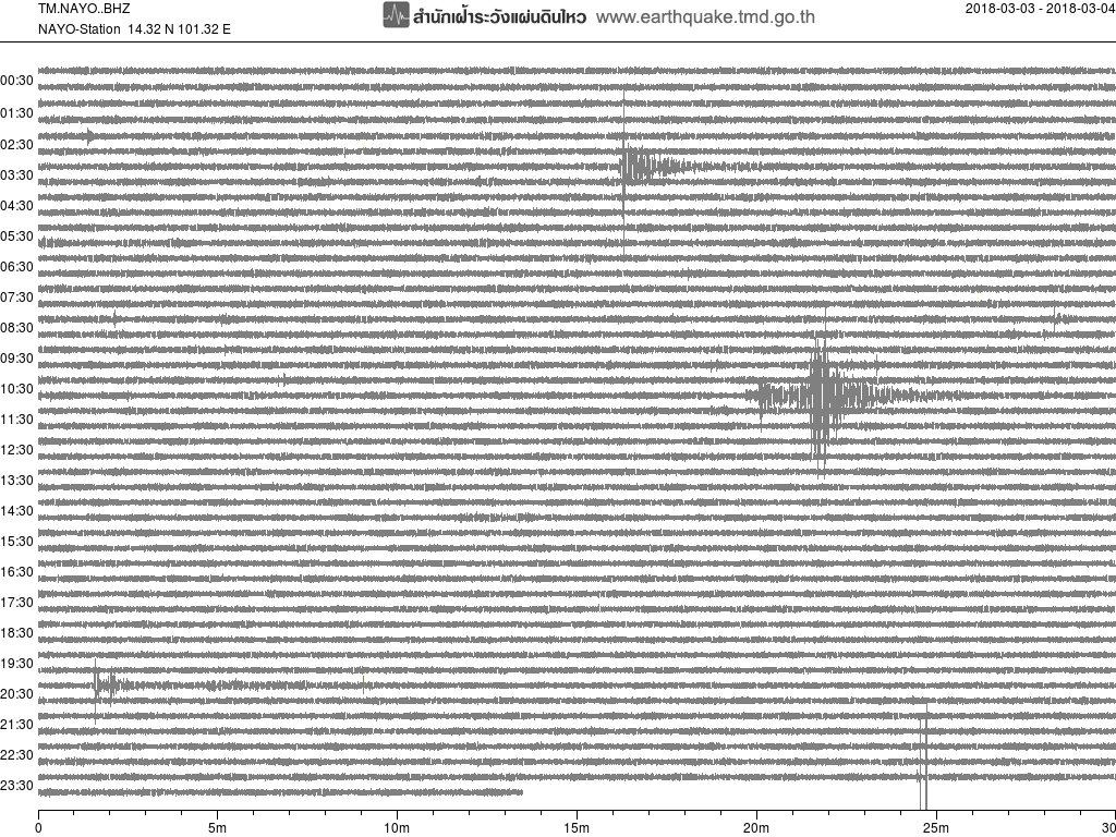 - กราฟแผ่นดินไหวจากสถานีนครนายก ของสำนักเฝ้าระวังฯ กรมอุตุฯ จากเวลา 07:00 เมื่อวานนี้ถึง 07:00 เช้านี้