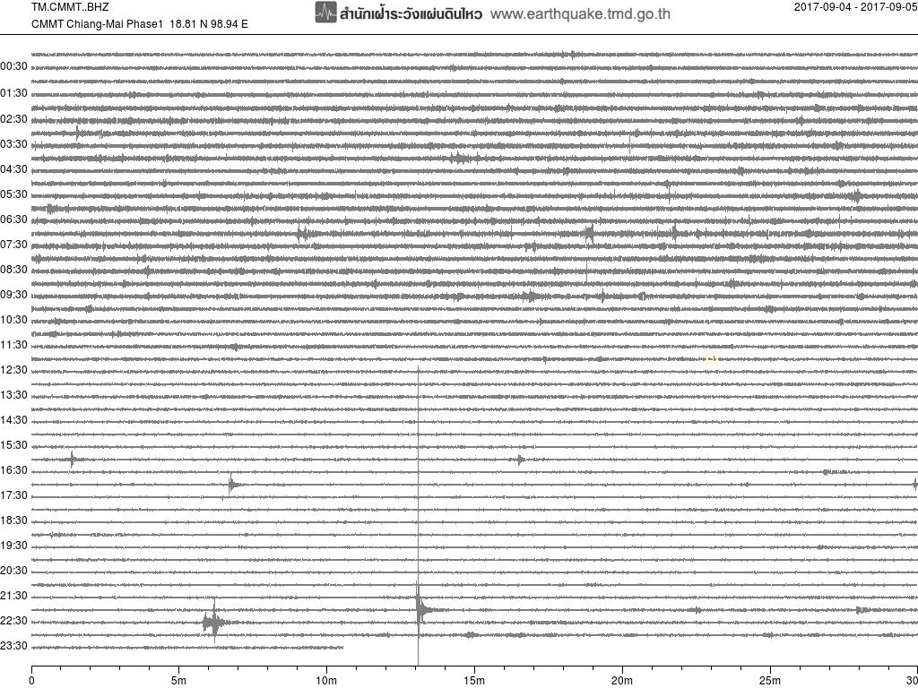 - กราฟแผ่นดินไหวจากสถานี สถานี CMMT จ.เชียงใหม่ ของสำนักเฝ้าระวังฯ กรมอุตุฯ จากเวลา 07:00 เมื่อวานนี้ถึง 07:00 เช้านี้