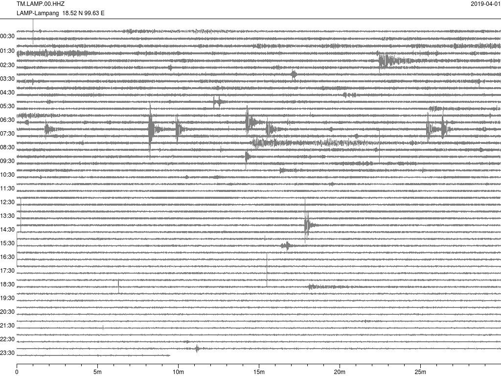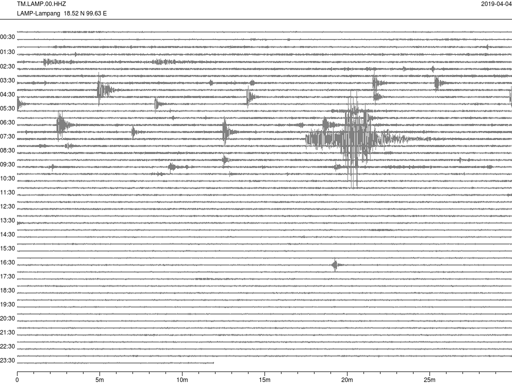 - กราฟแผ่นดินไหวจากสถานีเขื่อนกิ่วลม จ.ลำปาง (LAMP) ของสำนักเฝ้าระวังฯ กรมอุตุฯ จากเวลา 07:00 เมื่อวานนี้ถึง 07:00 เช้านี้