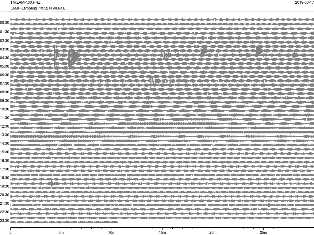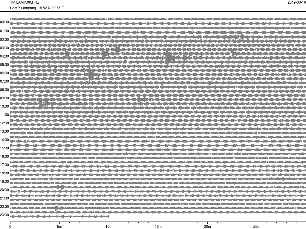 - กราฟแผ่นดินไหวจากสถานีเขื่อนกิ่วลม จ.ลำปาง (LAMP) ของสำนักเฝ้าระวังฯ กรมอุตุฯ จากเวลา 07:00 เมื่อวานนี้ถึง 07:00 เช้านี้