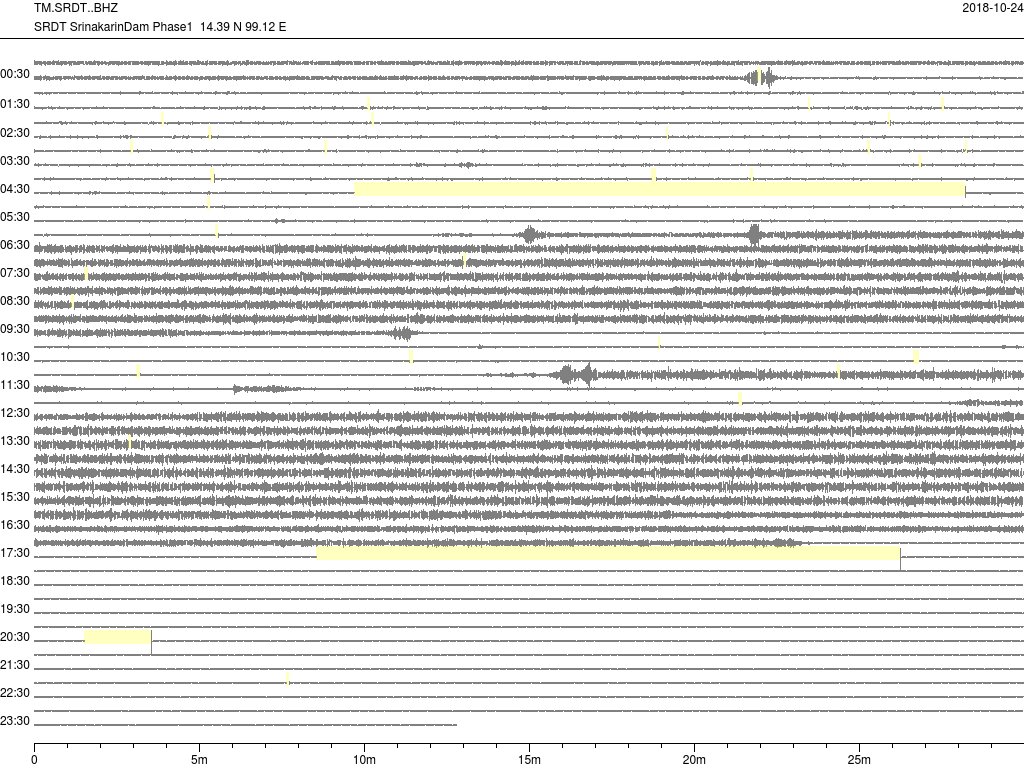 - กราฟแผ่นดินไหวจากสถานี SRDT เขื่อนศรีนครินทร์ ของสำนักเฝ้าระวังฯ กรมอุตุฯ จากเวลา 07:00 เมื่อวานนี้ถึง 07:00 เช้านี้