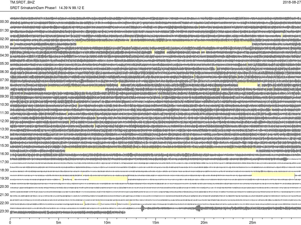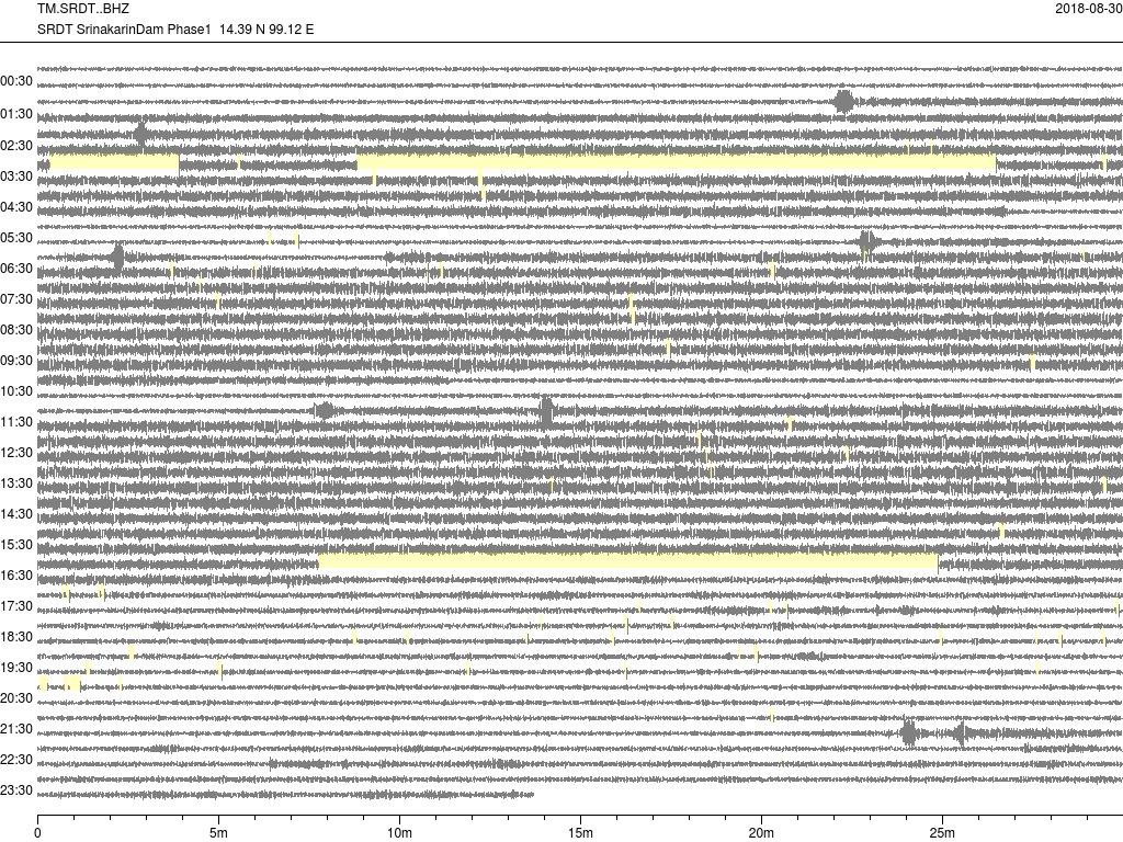 - กราฟแผ่นดินไหวจากสถานี เขื่อนสิริกิติ์ จ.อุตรดิตถ์ UTTA ของสำนักเฝ้าระวังฯ กรมอุตุฯ จากเวลา 07:00 เมื่อวานนี้ถึง 07:00 เช้านี้
