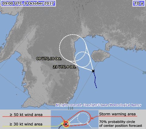 - 10:00 พายุโซนร้อนขนุน เคลื่อนตัวจากเกาะลูซอนลงทะเลจีนใต้แล้ว ขณะนี้กำลังมุ่งมาทางเกาะไหหลำ ระหว่างทางก็จะทวีกำลังขึ้นเรื่อยๆจนกลายเป็นพายุไต้ฝุ่น ศูนย์กลางพายุเวลานี้อยู่ที่พิกัด N17°30′ E119°25′ ความเร็วลม 35 น็อต ความกดอากาศ 992 hPa