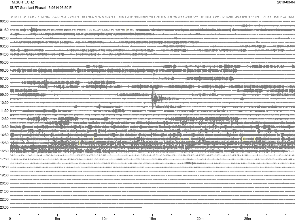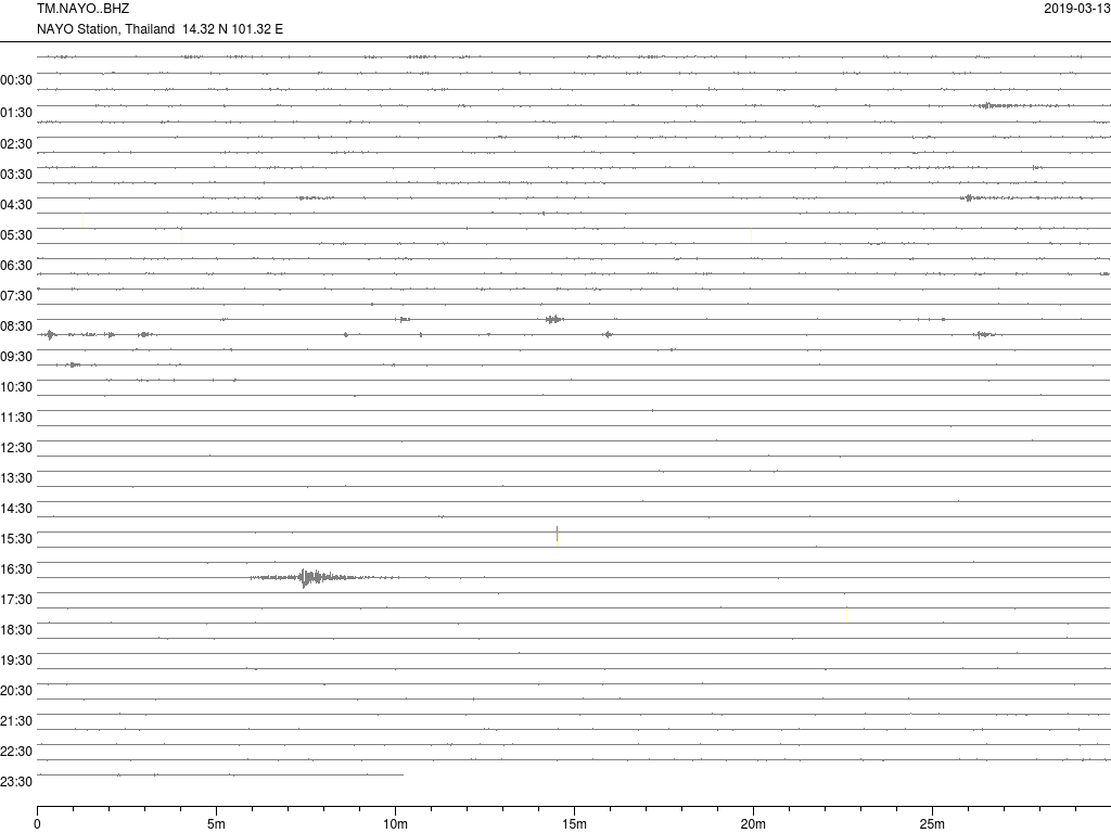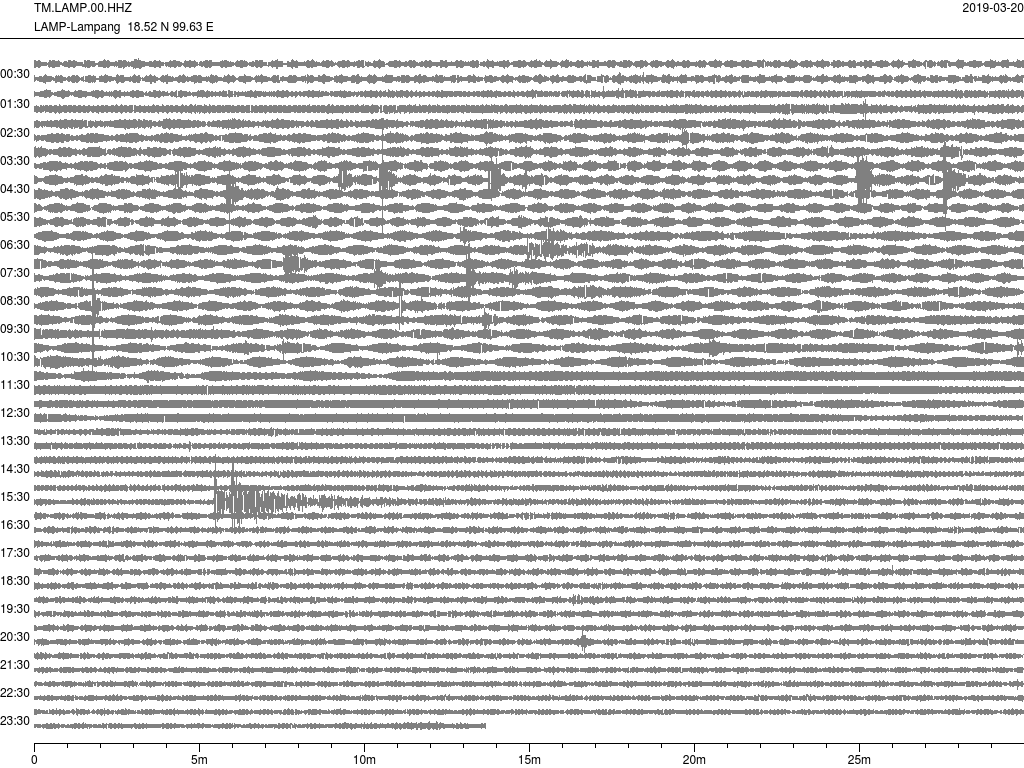 - กราฟแผ่นดินไหวจากสถานีเขื่อนกิ่วลม จ.ลำปาง (LAMP) ของสำนักเฝ้าระวังฯ กรมอุตุฯ จากเวลา 07:00 เมื่อวานนี้ถึง 07:00 เช้านี้
