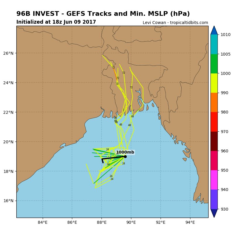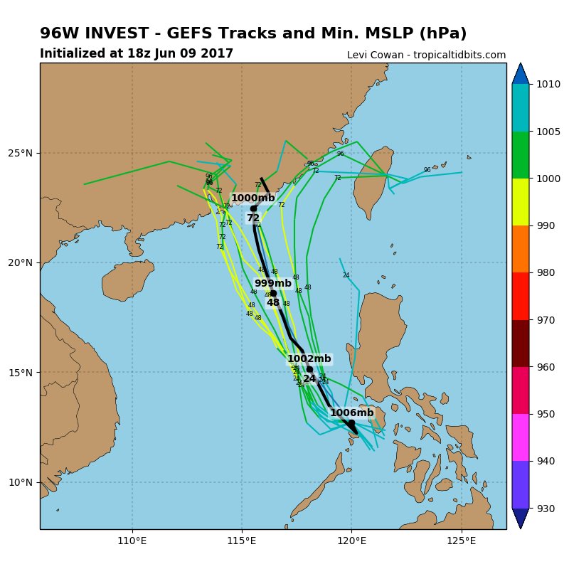 - 19:00 ศูนย์กลางหย่อมความกดอากาศต่ำ 96W ความเร็วลม 15 น็อต ความกดอากาศ 1006 hPa เวลานี้อยู่ที่พิกัด 11.0°N 122.9°E บนฝั่งประเทศฟิลิปปินส์