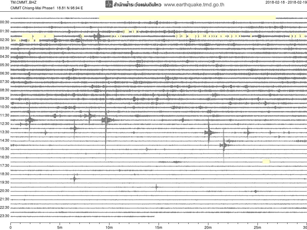 - กราฟแผ่นดินไหวจากสถานี SRDT เขื่อนศรีนครินทร์ ของสำนักเฝ้าระวังฯ กรมอุตุฯ จากเวลา 07:00 เมื่อวานนี้ถึง 07:00 เช้านี้