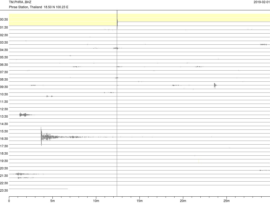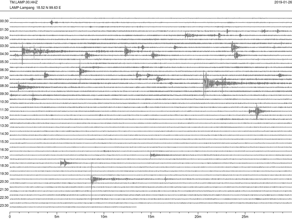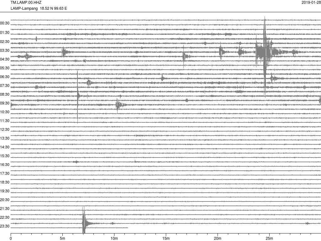 - กราฟแผ่นดินไหวจากสถานี เขื่อนกิ่วลม จ.ลำปาง (LAMP) ของสำนักเฝ้าระวังฯ กรมอุตุฯ จากเวลา 07:00 เมื่อวานนี้ถึง 07:00 เช้านี้