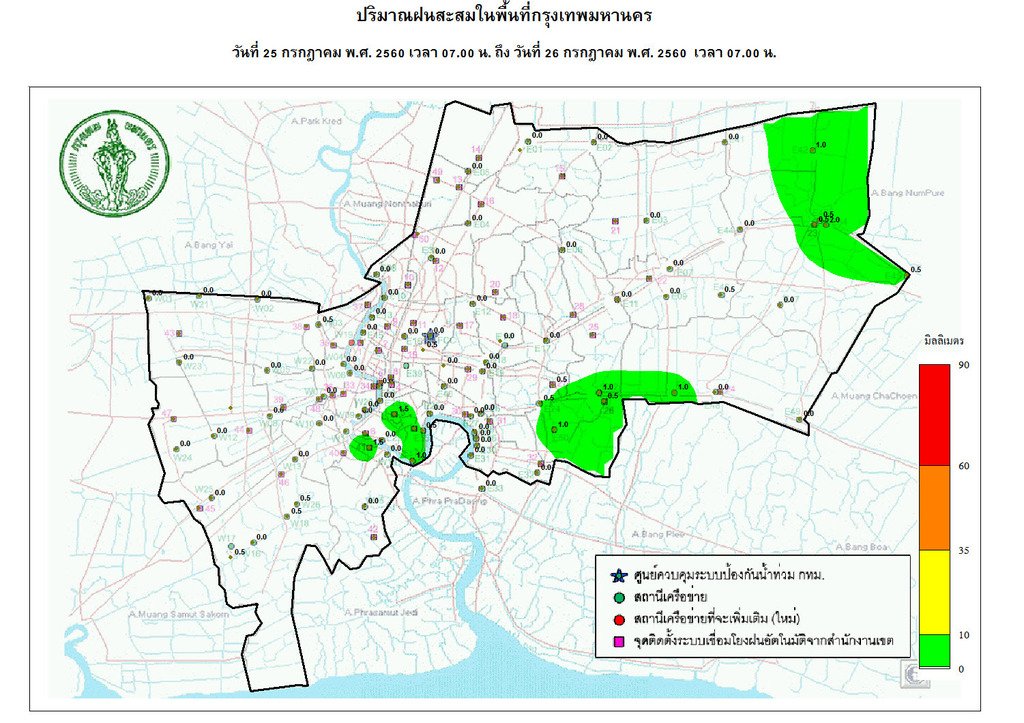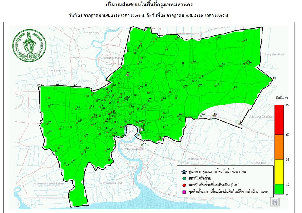 - 07:00 แผนที่แสดงปริมาณฝนในกรุงเทพฯย้อนหลัง 24 ชั่วโมงจากศูนย์ป้องกันน้ำท่วม กทม