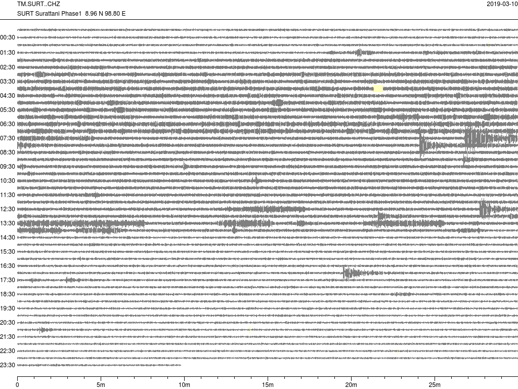 • กราฟแผ่นดินไหวจากสถานี จ.สุ​ราษฎร์​ธานี (SURT) ของสำนักเฝ้าระวังฯ กรมอุตุฯ จากเวลา 07:00 เมื่อวานนี้ถึง 07:00 เช้านี้