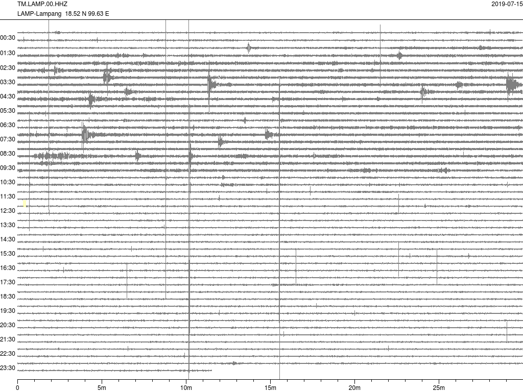 - 06:47 กราฟแผ่นดินไหวชนิดที่ใช้ดูเวลาเกิดเหตุเป็นหลัก แสดงภาพตามแนวตั้ง (BHZ) จากสถานีเครือข่าย IRIS สาขาเชียงใหม่ (CHTO) จาก 07:00 เช้าเมื่อวานนี้จนถึงเวลานี้ เส้นกราฟตามแนวนอนเส้นละ 10 นาที แยกสีเส้นกราฟเพื่อให้ดูได้ง่าย ช่องแบ่งตามแนวตั้งช่องละ 1 นาที