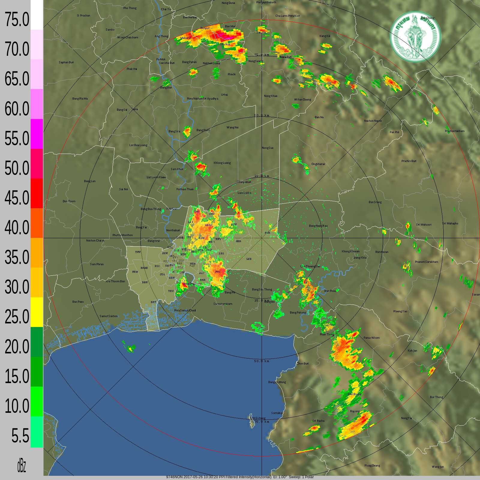 - 23:15 เรดาร์ฝน TMD ขอนแก่น (แบบเคลื่อนไหว) แสดงกลุ่มฝนที่ตกในภาคตะวันออกเฉียงเหนือ ช่วง 1 ชั่วโมง15 นาทีที่ผ่านมา (เวลาในภาพเป็นเวลา UTC ต้องบวก 7 ชั่วโมงให้เป็นเวลาไทย)