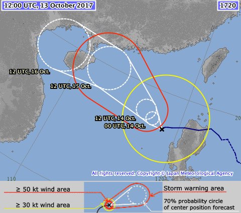 - 11:00 พายุดีเปรสชัน 25W ใกล้เกาะแย็ปทวีกำลังเป็นพายุโซนร้อน ได้ชื่อเรียกว่า “ลัง” Lan หมายถึง “ลมพายุ” ในภาษามาแชล มุ่งทิศเหนือ มีโอกาสเป็นไต้ฝุ่น