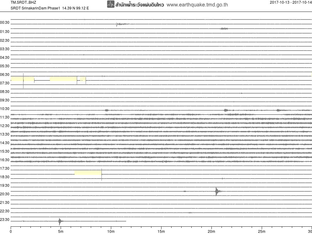 - กราฟแผ่นดินไหวจากสถานี สถานี SRDT เขื่อนศรีนครินทร์ ของสำนักเฝ้าระวังฯ กรมอุตุฯ จากเวลา 07:00 เมื่อวานนี้ถึง 07:00 เช้านี้