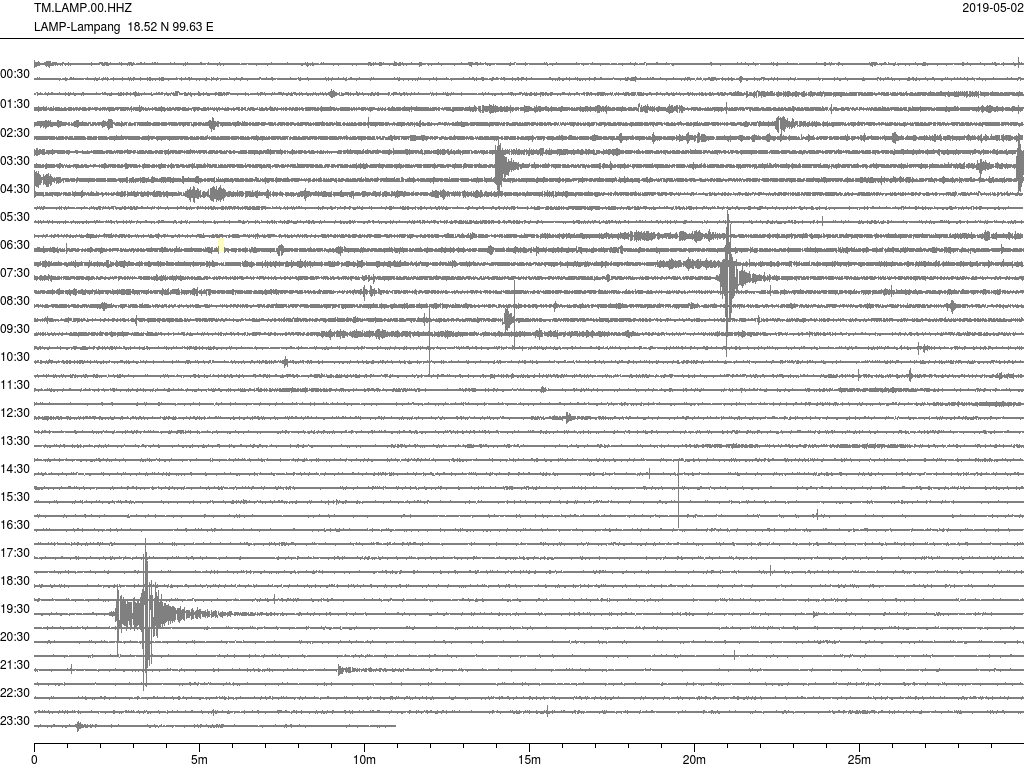 - กราฟแผ่นดินไหวจากสถานีเขื่อนกิ่วลม จ.ลำปาง (LAMP) ของสำนักเฝ้าระวังฯ กรมอุตุฯ จากเวลา 07:00 เมื่อวานนี้ถึง 07:00 เช้านี้