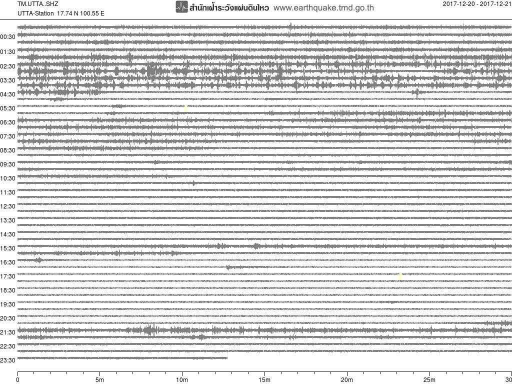 - 06:45 กราฟแผ่นดินไหว ช่วง 24 ชั่วโมงที่ผ่านมา บันทึกจากสถานีกรุงเนปิดอว์ ประเทศพม่า (กราฟนี้เน้นใช้ประโยชน์เรื่องของเวลาที่เกิดแผ่นดินไหว โดยแยกสีเป็นแดงน้ำเงินสีละครึ่งชั่วโมงเพื่อให้ดูง่าย ส่วนเรื่องขนาดแผ่นดินไหว กราฟนี้ไม่อาจใช้ระบุตัวเลขที่ชัดเจน)