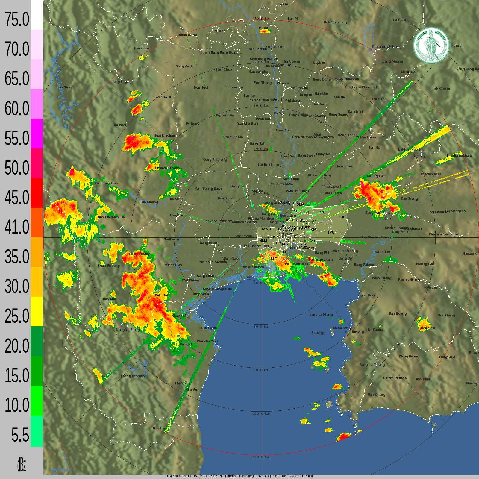 - 17:30 ฝนจากอ่าวไทย เคลื่อนเข้ามาตกใน กทม เขตบางขุนเทียน ทุ่งครุ และ อ.พระสมุทรเจดีย์ อ.เมืองสมุทรปราการ มีฝนหนักในราชบุรี เพชรบุรี นครนายก ดูภาพเรดาร์