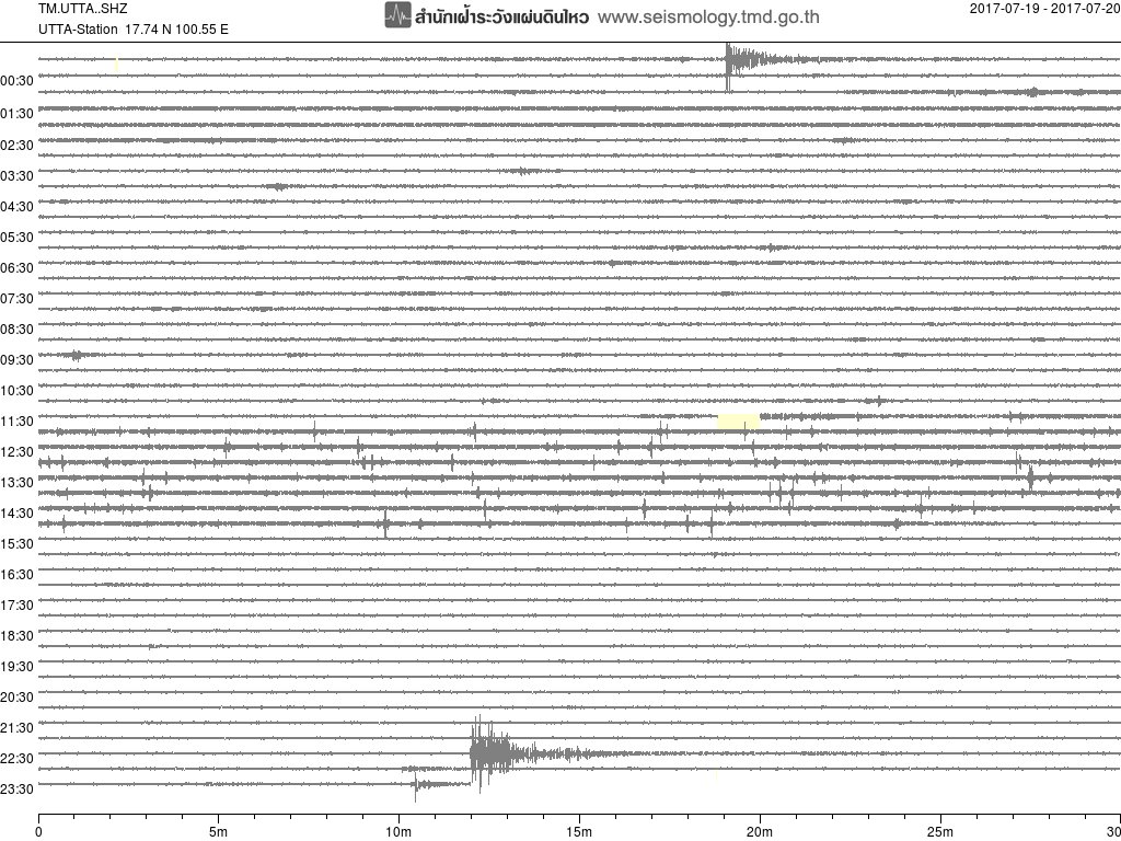 - กราฟแผ่นดินไหวจากสถานีเขื่อนกิ่วลม จ.ลำปาง(LAMP) ของสำนักเฝ้าระวังฯ กรมอุตุฯ จากเวลา 07:00 เมื่อวานนี้ถึง 06:45 เช้านี้