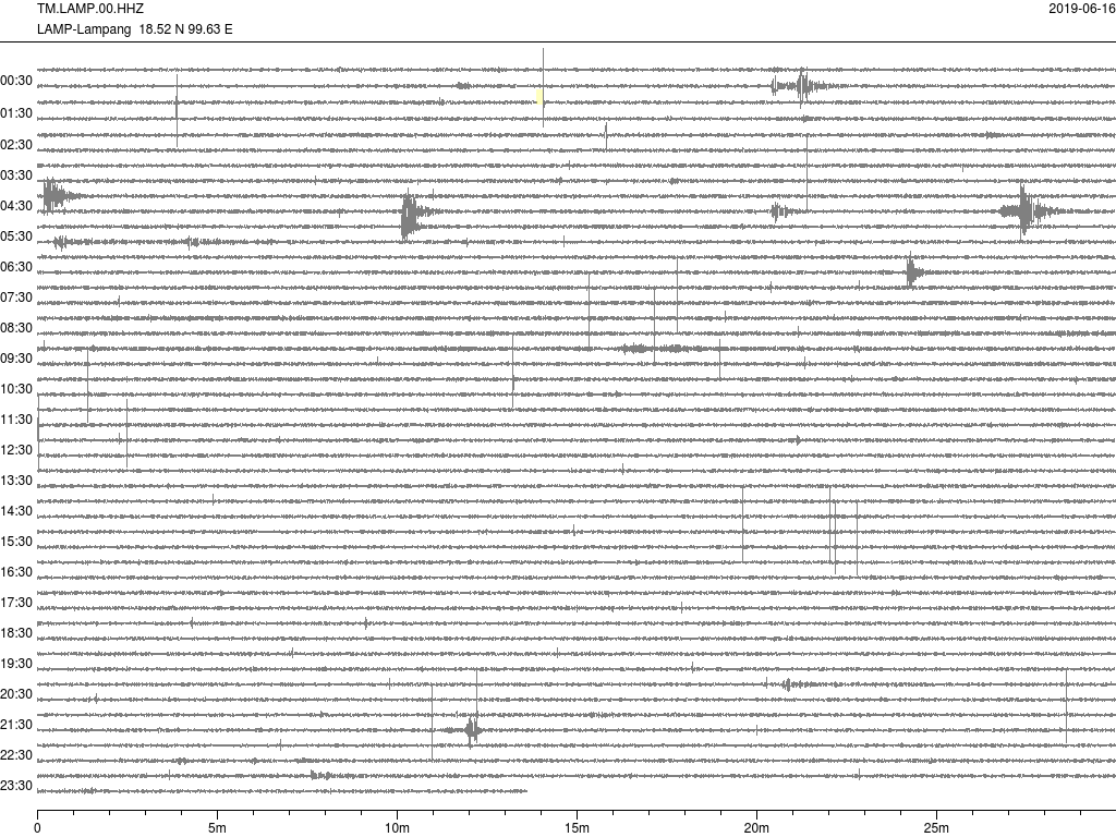 - กราฟแผ่นดินไหวจากสถานีเขื่อนวชิราลงกรณ์ จ.กาญจนบุรี(KHLT) ของสำนักเฝ้าระวังฯ กรมอุตุฯ จากเวลา 07:00 เมื่อวานนี้ถึง 06:45 เช้านี้