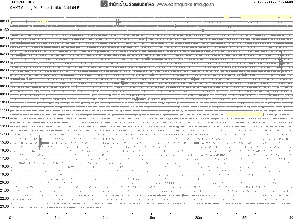- กราฟแผ่นดินไหวจากสถานี สถานี CMMT จ.เชียงใหม่ ของสำนักเฝ้าระวังฯ กรมอุตุฯ จากเวลา 07:00 เมื่อวานนี้ถึง 07:00 เช้านี้