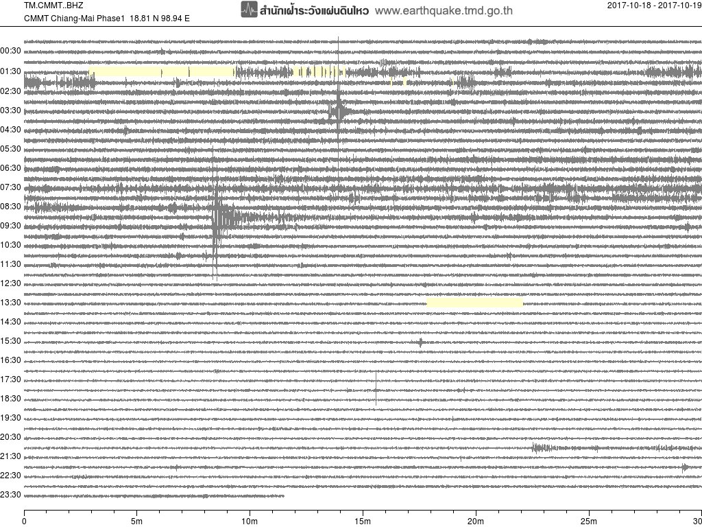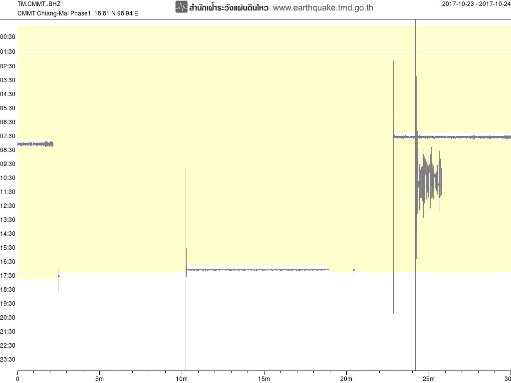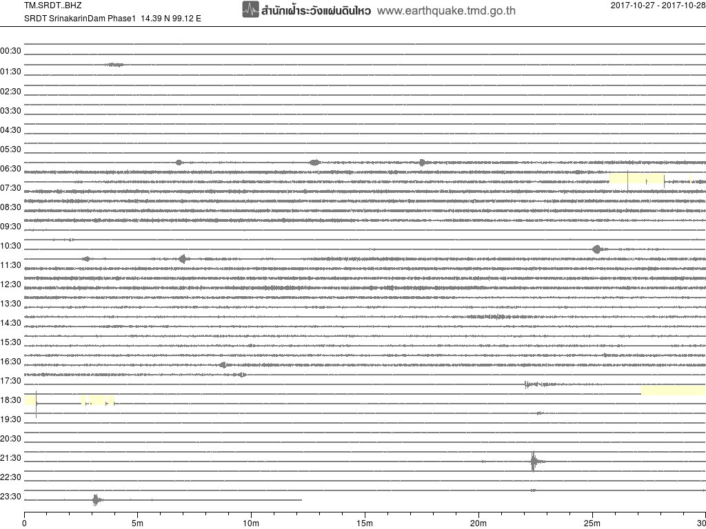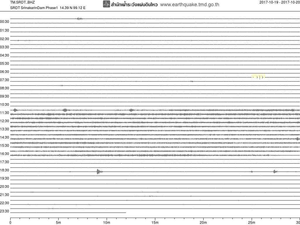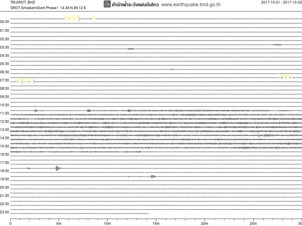 - กราฟแผ่นดินไหวจากสถานี สถานี SRDT เขื่อนศรีนครินทร์ ของสำนักเฝ้าระวังฯ กรมอุตุฯ จากเวลา 07:00 เมื่อวานนี้ถึง 07:00 เช้านี้