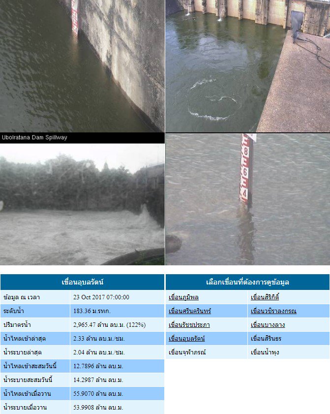 - 07:00 เขื่อนอุบลรัตน์วานนี้ น้ำไหลเข้าเหลือ 35 ล้าน m³ แต่ยังระบาย 45 ล้าน m³ ซึ่งน่าจะพิจารณาลดการระบายได้อีกมาก ท้ายน้ำจะได้เดือดร้อนน้อยลง เช้านี้เหลือปริมาณน้ำในเขื่อน 120%