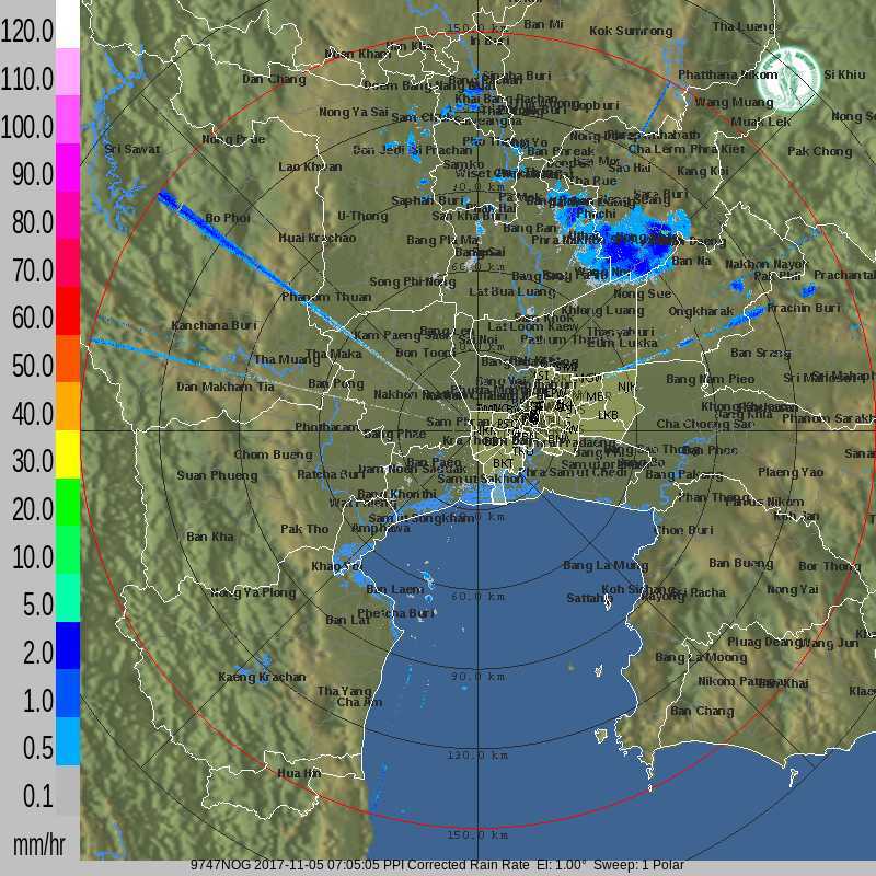 - 16:55 เรดาร์ กทม แสดงลักษณะกลุ่มฝนบาง-ปานกลาง ที่เคลื่อนผ่าน กรุงเทพฯ สมุทรปราการ สมุทรสาคร ไปทางสมุทรสงคราม ราชบุรี เพชรบุรี