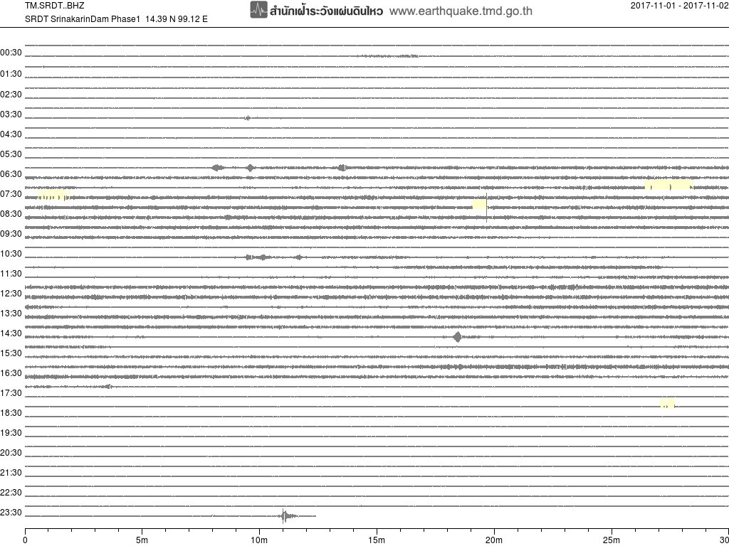 - กราฟแผ่นดินไหวจากสถานี CMMT จ.เชียงใหม่ ของสำนักเฝ้าระวังฯ กรมอุตุฯ จากเวลา 07:00 เมื่อวานนี้ถึง 07:00 เช้านี้