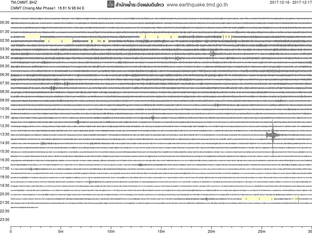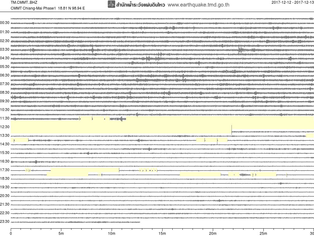 - กราฟแผ่นดินไหวจากสถานี เขื่อนสิริกิติ์ จ.อุตรดิตถ์ UTTA ของสำนักเฝ้าระวังฯ กรมอุตุฯ จากเวลา 07:00 เมื่อวานนี้ถึง 07:00 เช้านี้