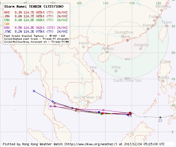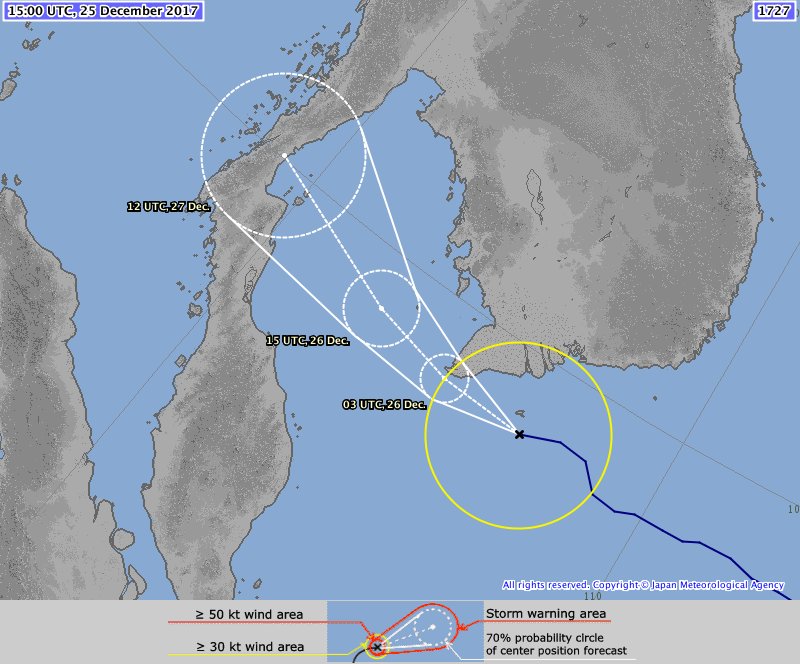 - 07:00 พายุโซนร้อนเทมบิง อ่อนกำลังเป็นดีเปรสชัน ความกดอากาศ 1006 hPa ที่พิกัด 8.0°N 105.0°E กลางอ่าวไทย ความเร็วลมลดลงเหลือ 15 น็อต จะไม่มีการ “ขึ้นฝั่ง” จังหวัดใดๆ คงเหลือหย่อมความกดอากาศต่ำหลังการสลายตัว (RMNTs) ที่ก่อฝนไป 1-3 วัน