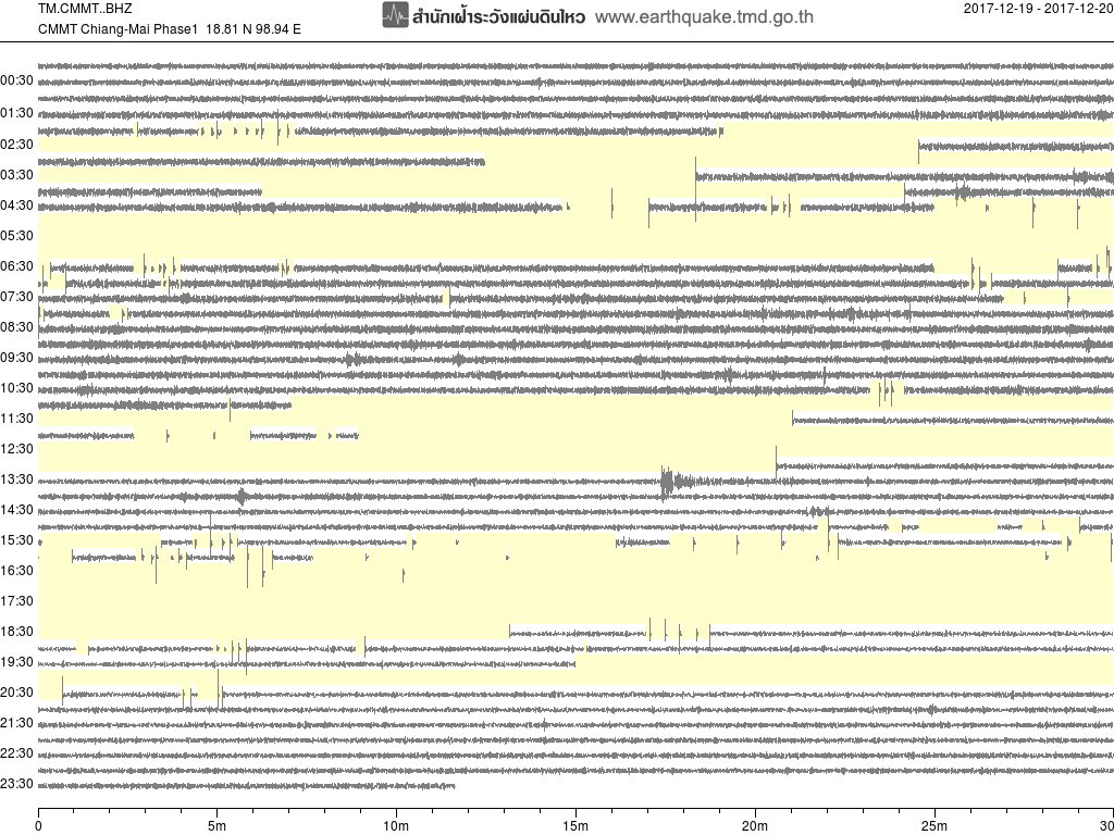 - กราฟแผ่นดินไหวจากสถานี สถานี CMMT เชียงใหม่ ของสำนักเฝ้าระวังฯ กรมอุตุฯ จากเวลา 07:00 เมื่อวานนี้ถึง 07:00 เช้านี้