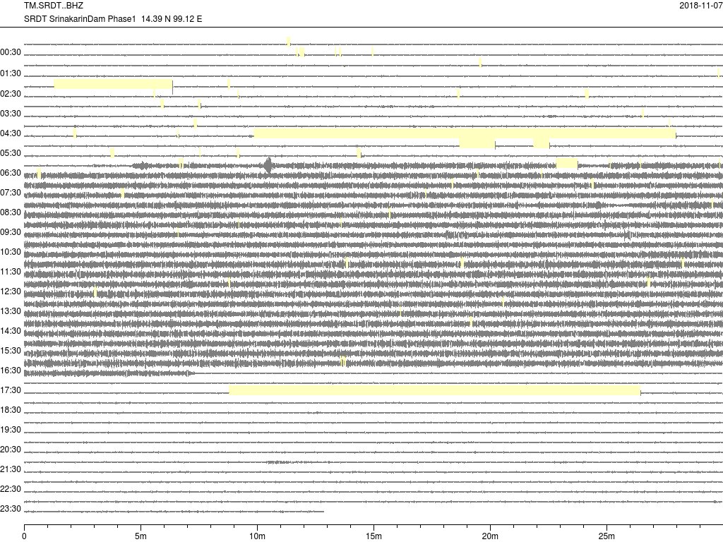 - กราฟแผ่นดินไหวจากสถานี SRDT เขื่อนศรีนครินทร์ ของสำนักเฝ้าระวังฯ กรมอุตุฯ จากเวลา 07:00 เมื่อวานนี้ถึง 07:00 เช้านี้