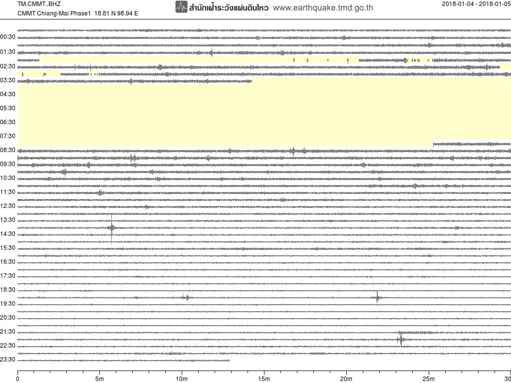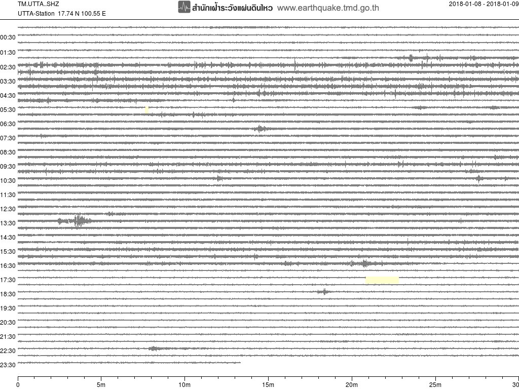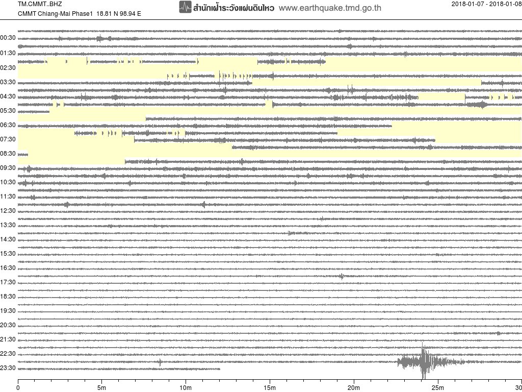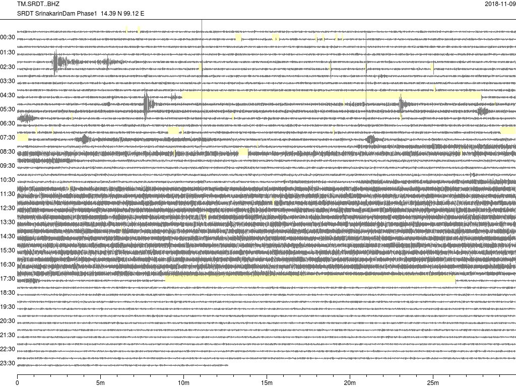 - กราฟแผ่นดินไหวจากสถานี SRDT เขื่อนศรีนครินทร์ ของสำนักเฝ้าระวังฯ กรมอุตุฯ จากเวลา 07:00 เมื่อวานนี้ถึง 07:00 เช้านี้