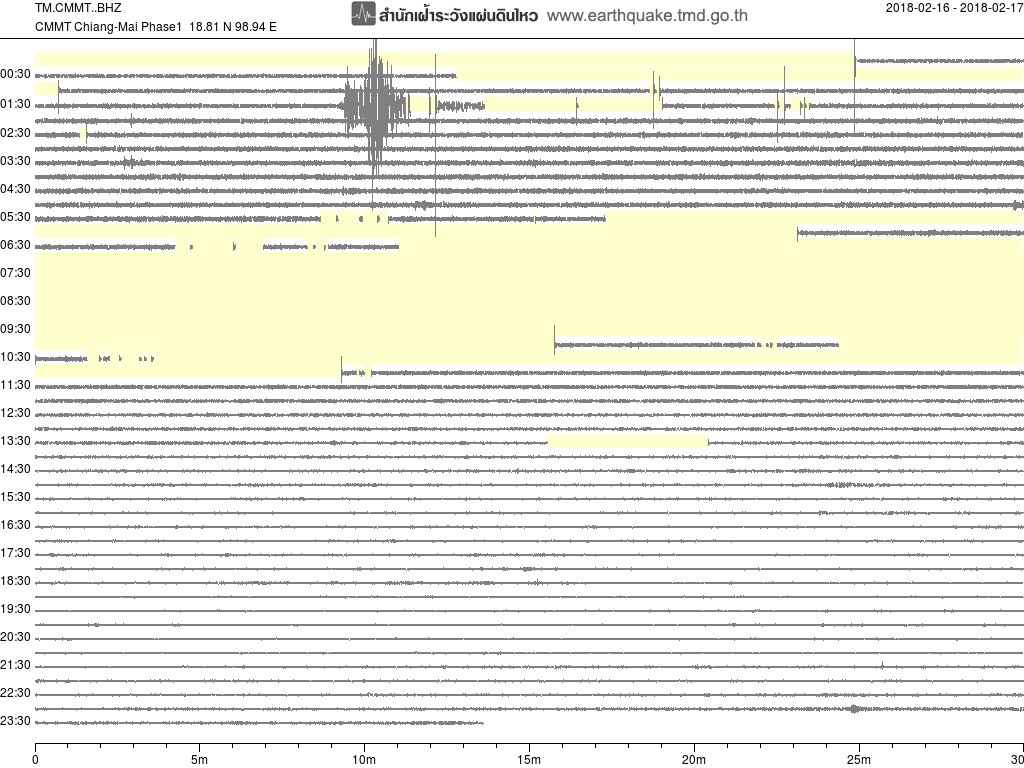 - กราฟแผ่นดินไหวจากสถานี CMMT เชียงใหม่ ของสำนักเฝ้าระวังฯ กรมอุตุฯ จากเวลา 07:00 เมื่อวานนี้ถึง 07:00 เช้านี้