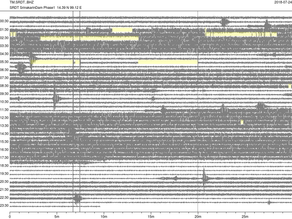 - กราฟแผ่นดินไหวจากสถานี SRDT เขื่อนศรีนครินทร์ ของสำนักเฝ้าระวังฯ กรมอุตุฯ จากเวลา 07:00 เมื่อวานนี้ถึง 07:00 เช้านี้
