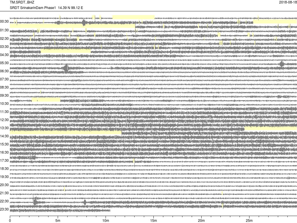 - กราฟแผ่นดินไหวจากสถานี UTTA เขื่อนสิริกิติ์ จ.อุตรดิตถ์ ของสำนักเฝ้าระวังฯ กรมอุตุฯ จากเวลา 07:00 เมื่อวานนี้ถึง 07:00 เช้านี้