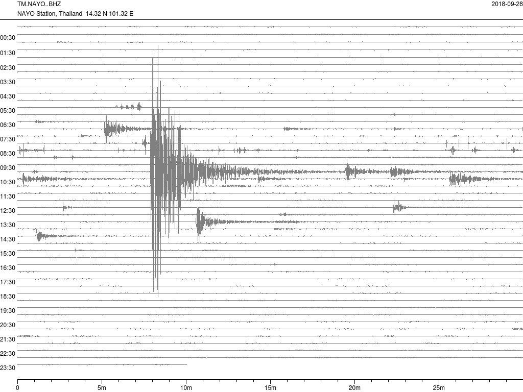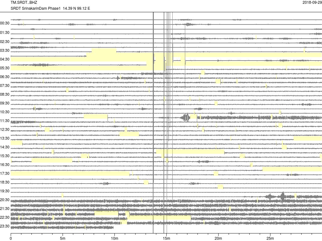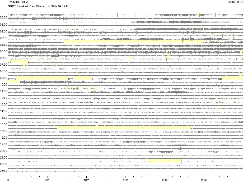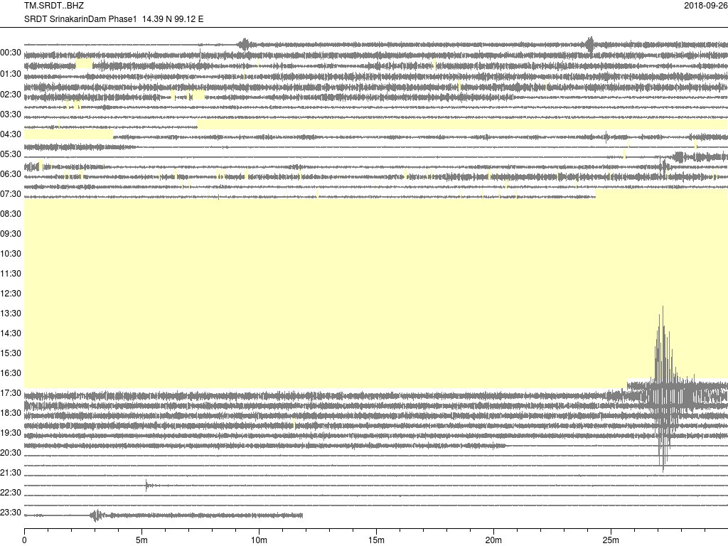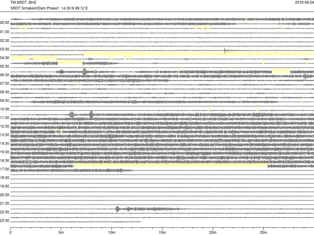 - กราฟแผ่นดินไหวจากสถานี SRDT เขื่อนศรีนครินทร์ ของสำนักเฝ้าระวังฯ กรมอุตุฯ จากเวลา 07:00 เมื่อวานนี้ถึง 07:00 เช้านี้