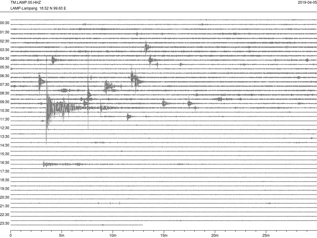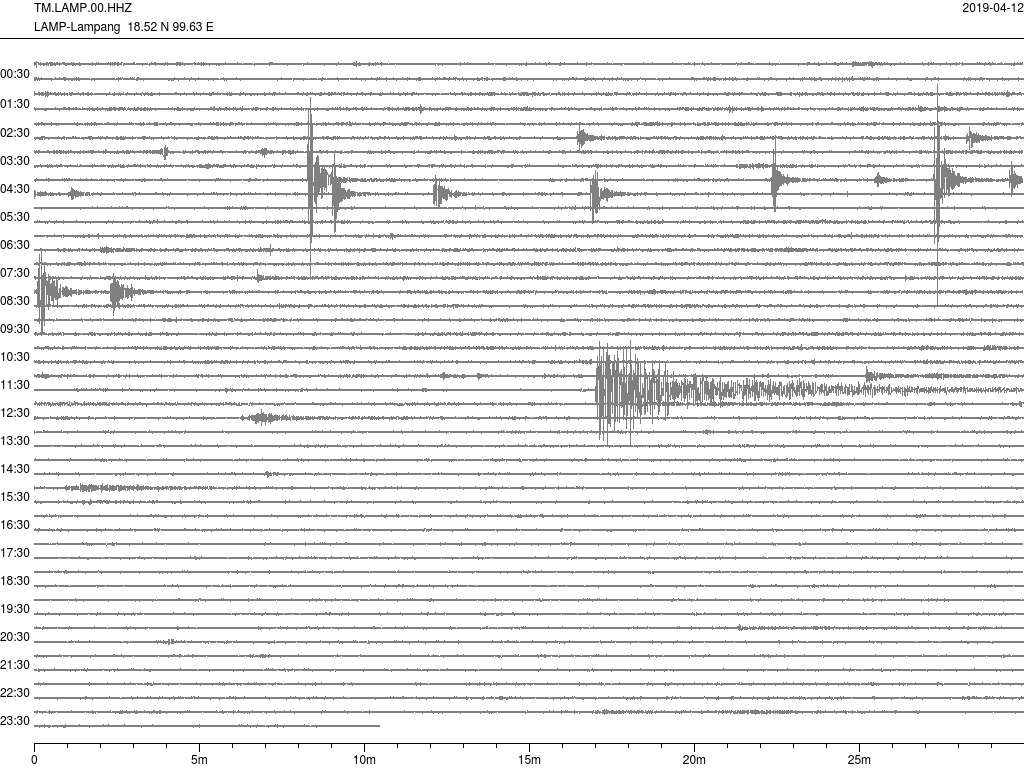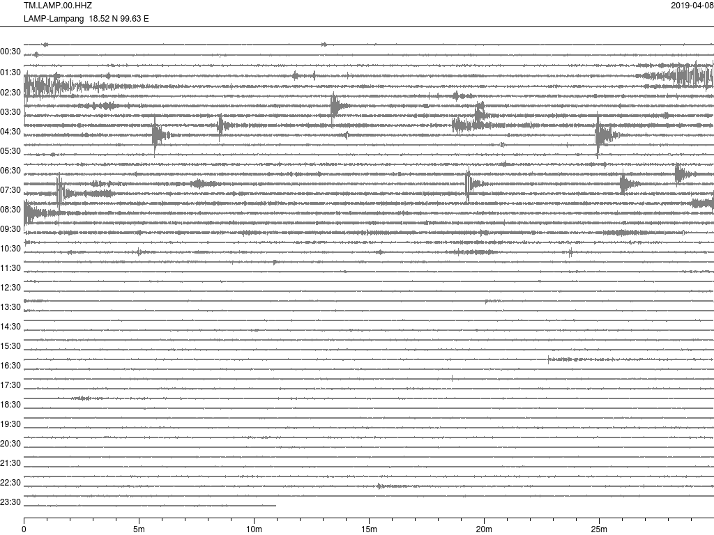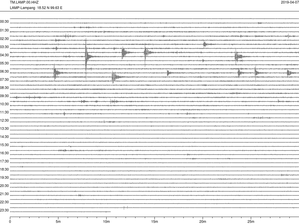- กราฟแผ่นดินไหวจากสถานีเขื่อนกิ่วลม จ.ลำปาง (LAMP) ของสำนักเฝ้าระวังฯ กรมอุตุฯ จากเวลา 07:00 เมื่อวานนี้ถึง 07:00 เช้านี้