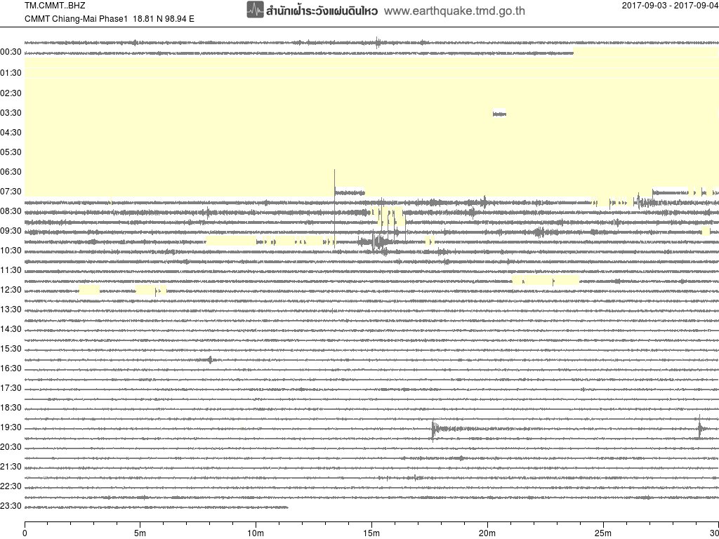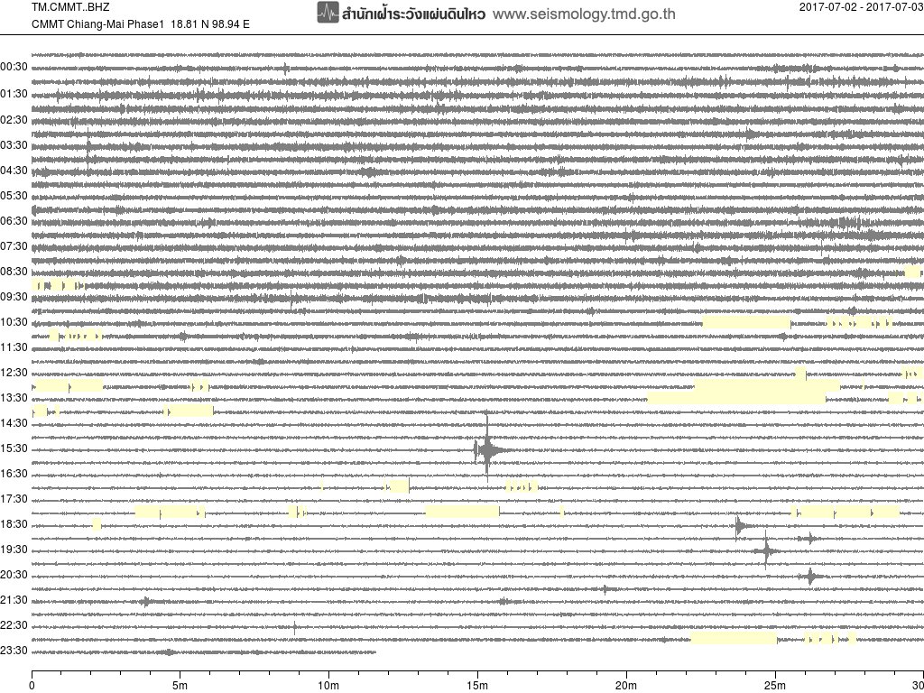 - กราฟแผ่นดินไหวจากสถานี อ.สุขสำราญ จ.ระนอง (RNTT) ของสำนักเฝ้าระวังฯ กรมอุตุฯ จากเวลา 07:00 เมื่อวานนี้ถึง 06:45 เช้านี้