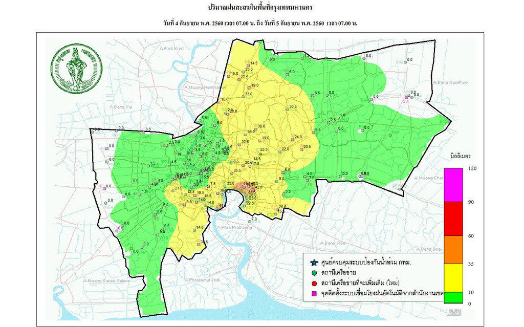 - 07:00 แผนที่แสดงปริมาณฝนในกรุงเทพฯย้อนหลัง 24 ชั่วโมงจากศูนย์ป้องกันน้ำท่วม กทม