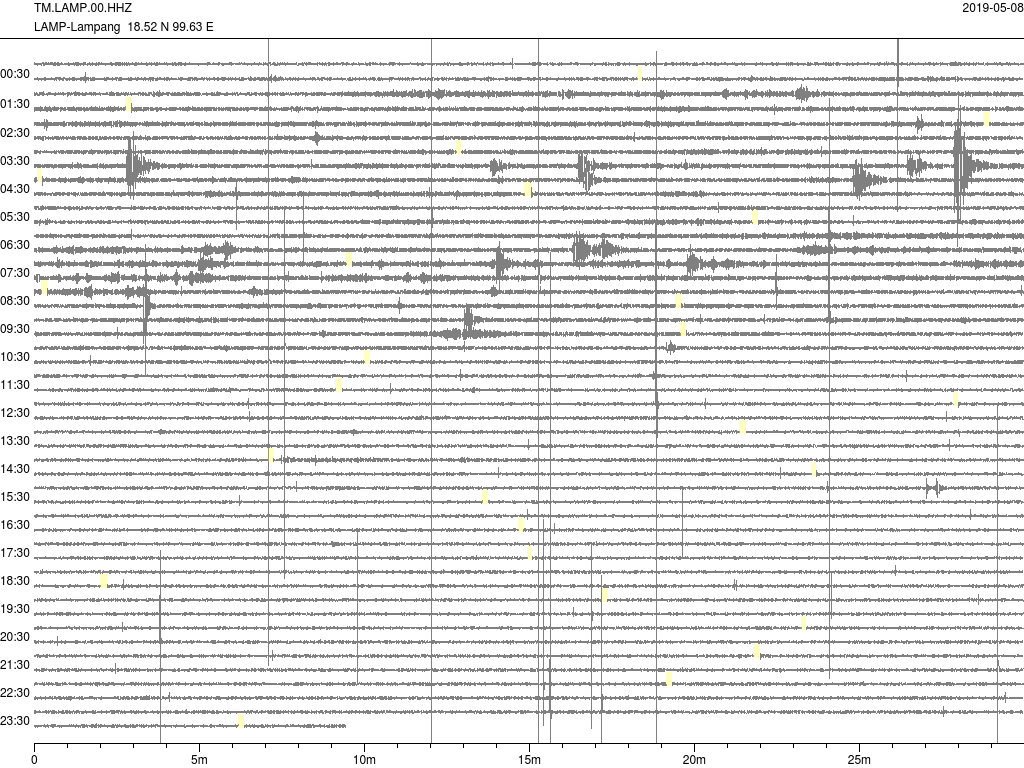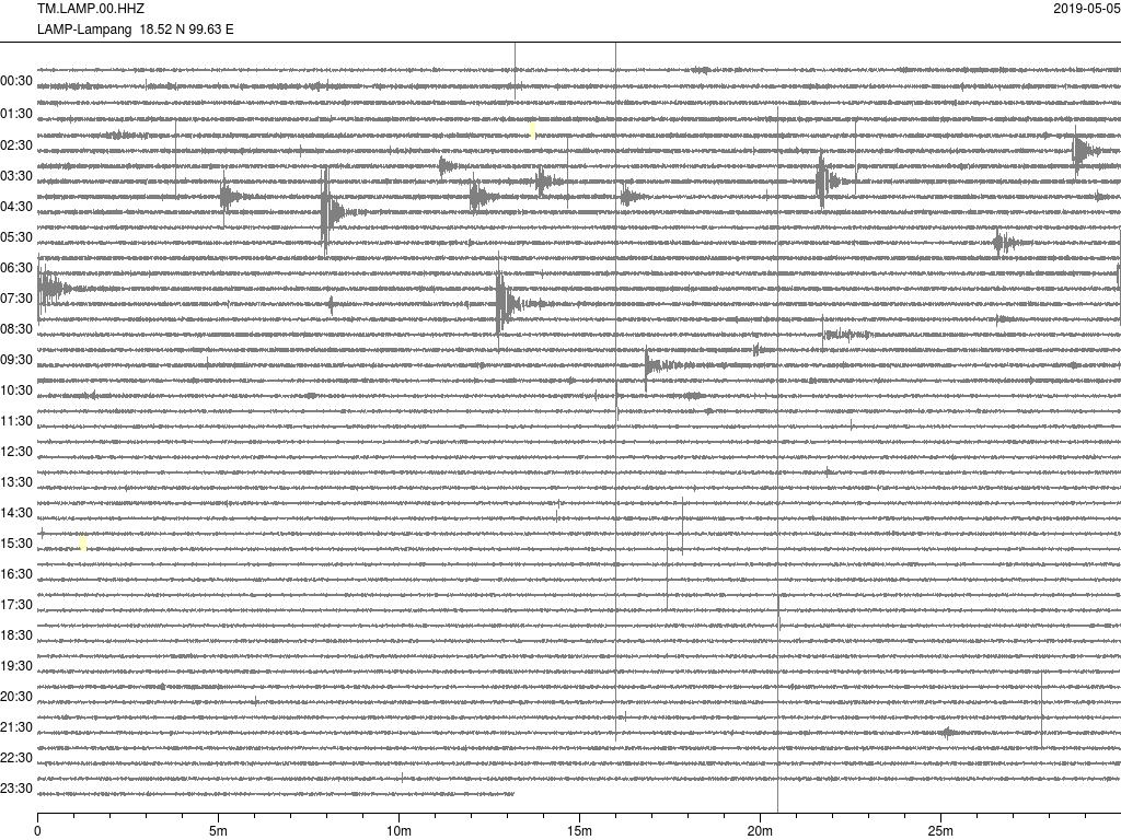 - กราฟแผ่นดินไหวจากสถานีเขื่อนกิ่วลม จ.ลำปาง(LAMP) ของสำนักเฝ้าระวังฯ กรมอุตุฯ จากเวลา 07:00 เมื่อวานนี้ถึง 06:45 เช้านี้