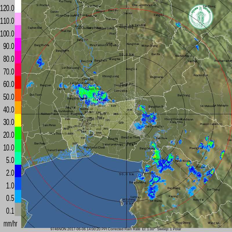 - 12:00 เรดาร์ฝนหนองจอก (แบบเคลื่อนไหว) ของศูนย์ป้องกันน้ำท่วม กทม. แสดงกลุ่มฝนที่ตกในกรุงเทพฯและปริมณฑลรวมทั้งบางจังหวัดในภาคกลางตอนล่างและภาคตะวันออก