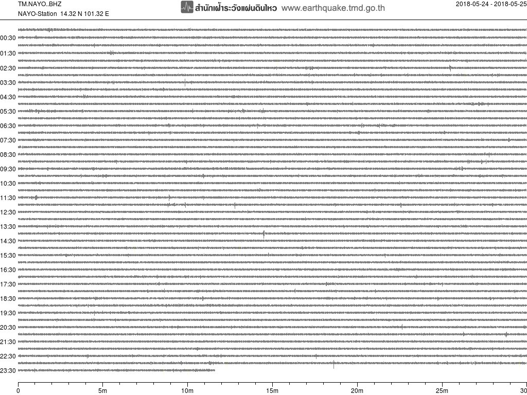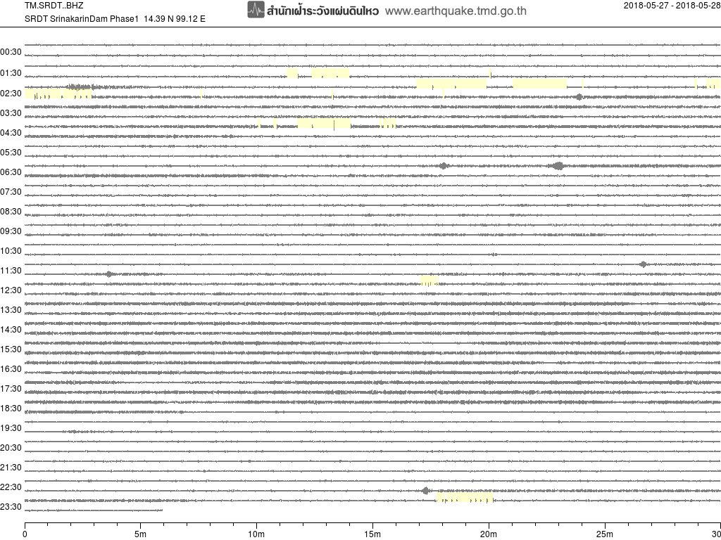- 06:45 กราฟแผ่นดินไหว ช่วง 24 ชั่วโมงที่ผ่านมา บันทึกจากสถานี เขื่อนวชิราลงกรณ์ กรมอุตุฯ (กราฟนี้เน้นใช้ประโยชน์เรื่องของเวลาที่เกิดแผ่นดินไหว โดยแยกสีเป็นแดงน้ำเงินสีละครึ่งชั่วโมงเพื่อให้ดูง่าย ส่วนเรื่องขนาดแผ่นดินไหว กราฟนี้ไม่อาจใช้ระบุตัวเลขที่ชัดเจน)