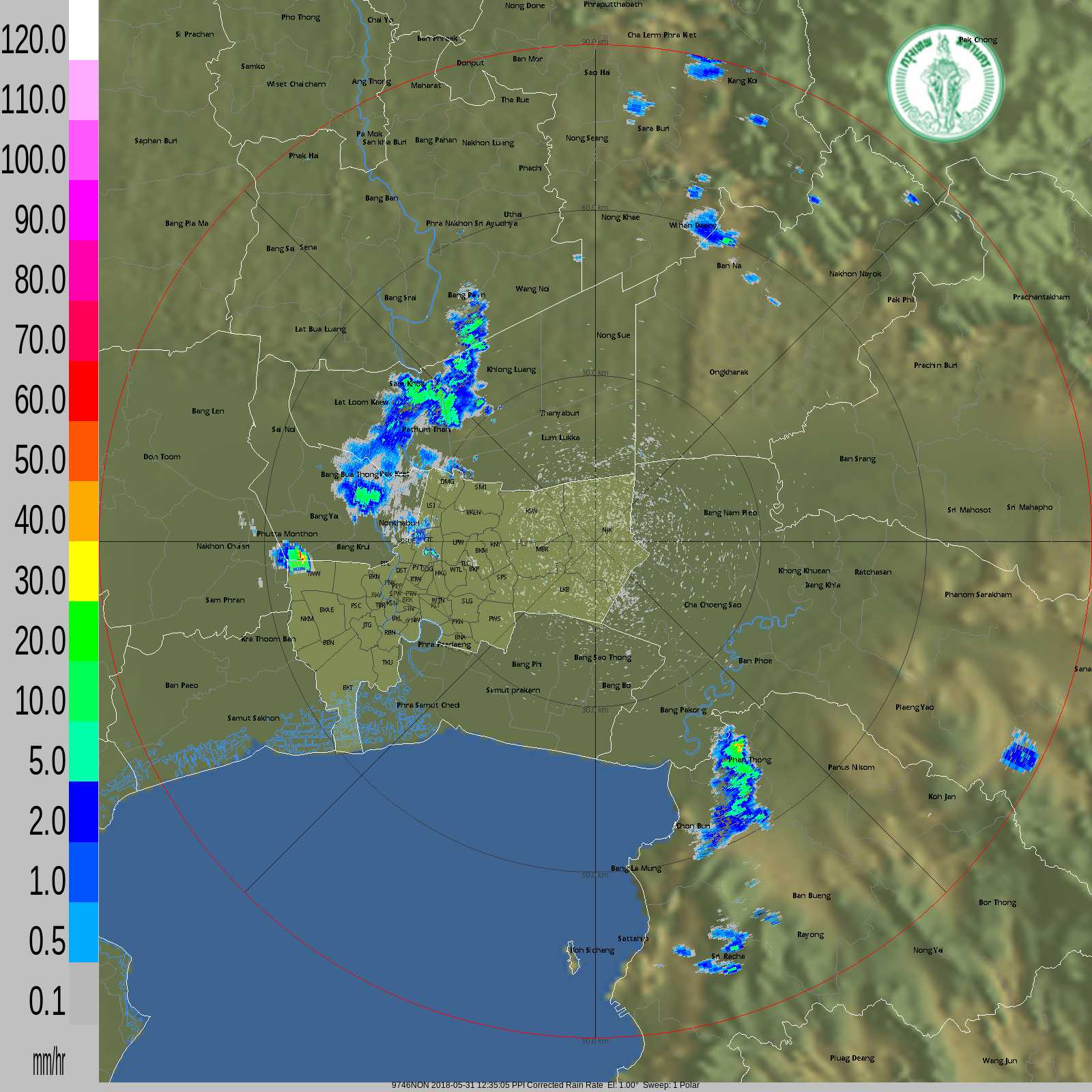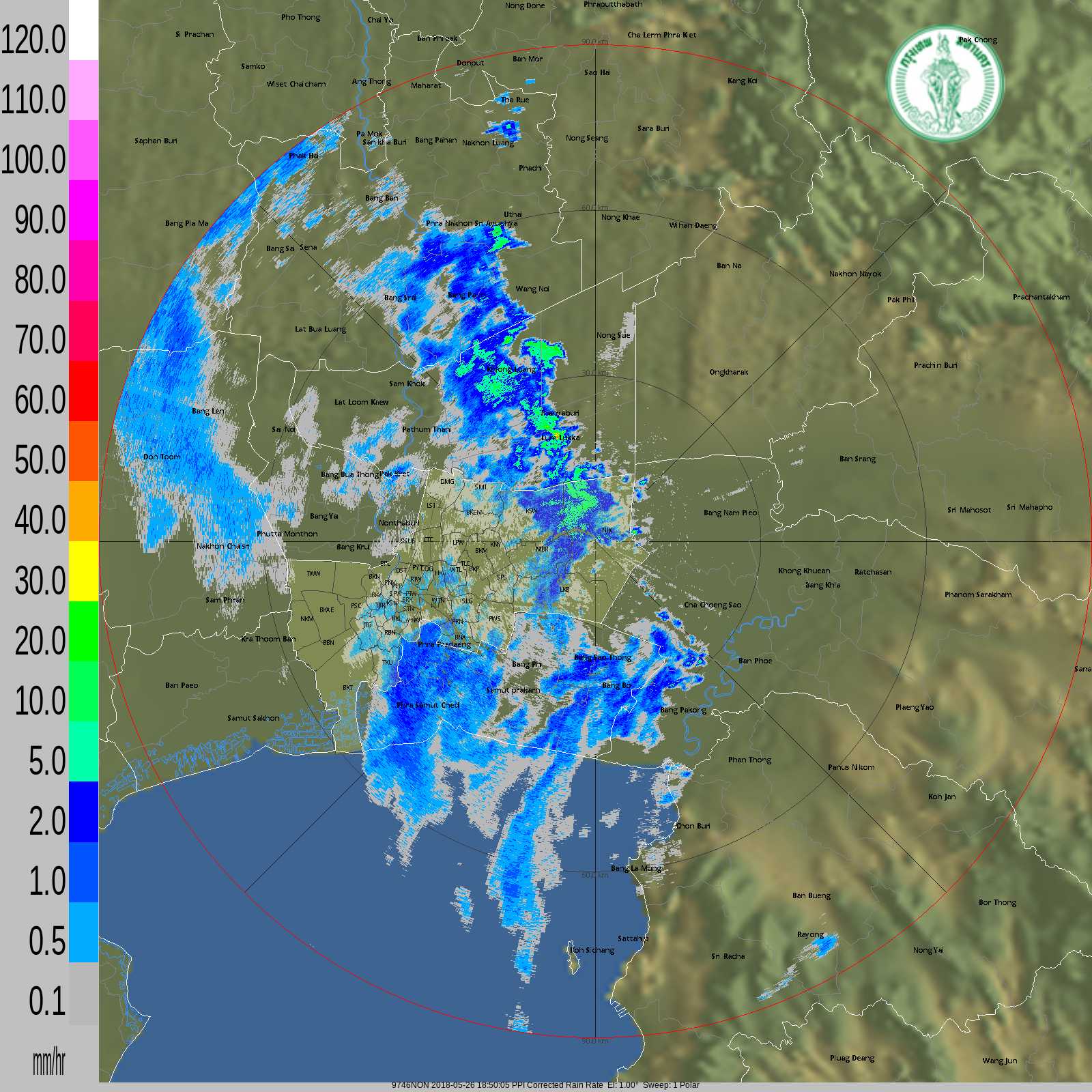 - 19:20 เรดาร์ตรวจฝนจากสำนักการระบายน้ำ กทม ที่หนองจอก (แบบเคลื่อนไหว) แสดงกลุ่มฝนที่ตกในกรุงเทพฯและปริมณฑลรวมทั้งบางจังหวัดในภาคกลางตอนล่างและภาคตะวันออกตลอด 25 นาทีที่ผ่านมา