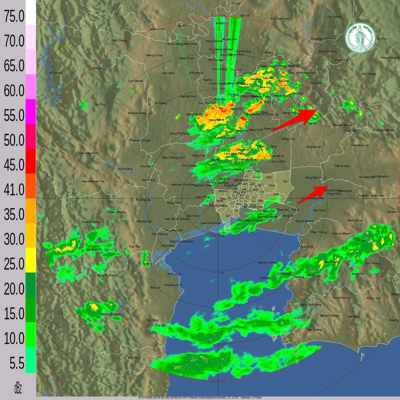 • 18:00 ฝนเล็กน้อยถึงปานกลาง อ.เมืองสมุทรสาคร อ.กระทุ่มแบนเคลื่อนตัวเข้าเขตบางขุนเทียน หนองแขม บางบอน ตลิ่งชัน บางกอกน้อย วังทองหลาง บางพลัด ดุสิต บางซื่อ หลักสี่ ต่อเนื่อง อ.เมืองนนทบุรี [ดูภาพเรดาร์]