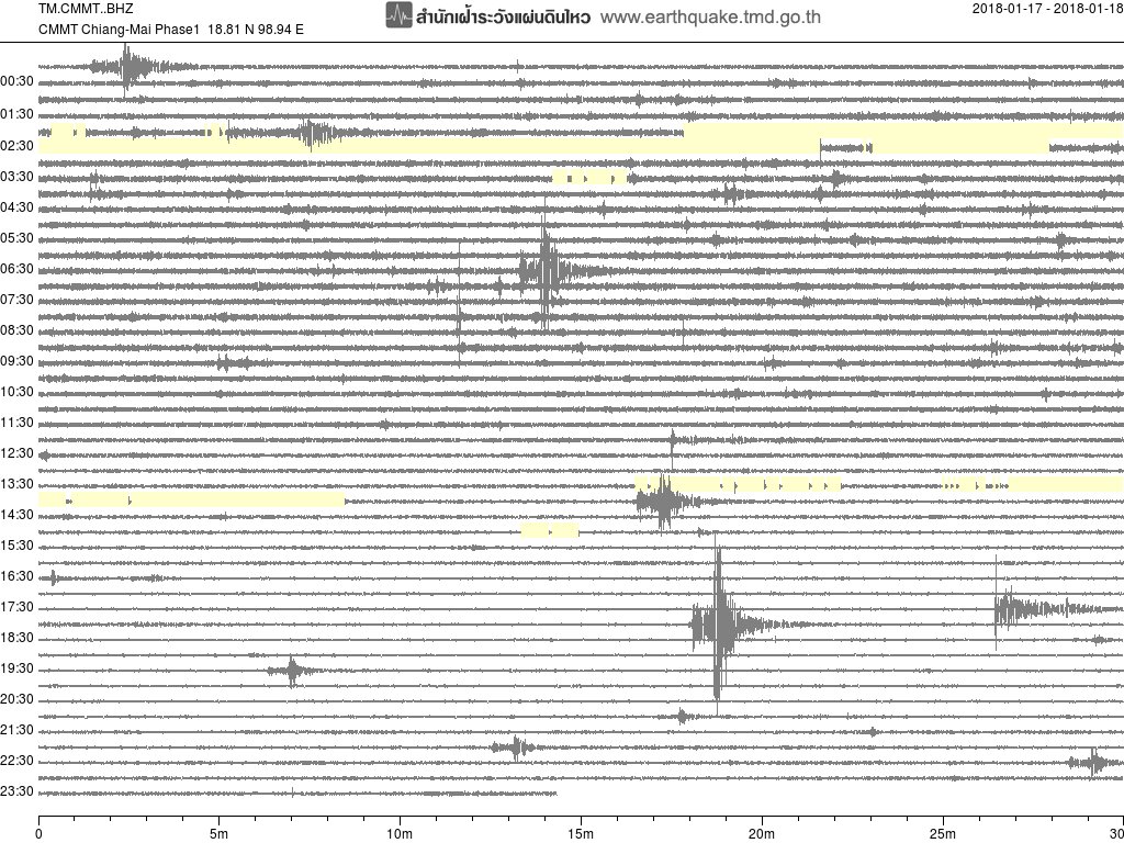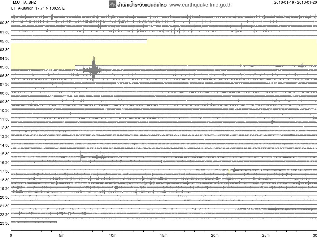 - กราฟแผ่นดินไหวจากสถานี เขื่อนสิริกิติ์ จ.อุตรดิตถ์ UTTA ของสำนักเฝ้าระวังฯ กรมอุตุฯ จากเวลา 07:00 เมื่อวานนี้ถึง 07:00 เช้านี้